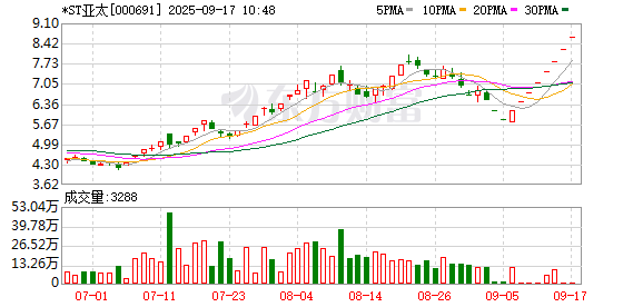 *ST亚太(维权)盘中涨停,已连收8个涨停板,截至9:25,该股报8.61元,换手率0.02%,成交量6.00万股,成交金额51.66万元,涨停板封单金额为5802.11万元。连续涨停期间,该股累计上涨47.68%,累计换手率为9.78%。最新A股总市值达27.83亿元。
